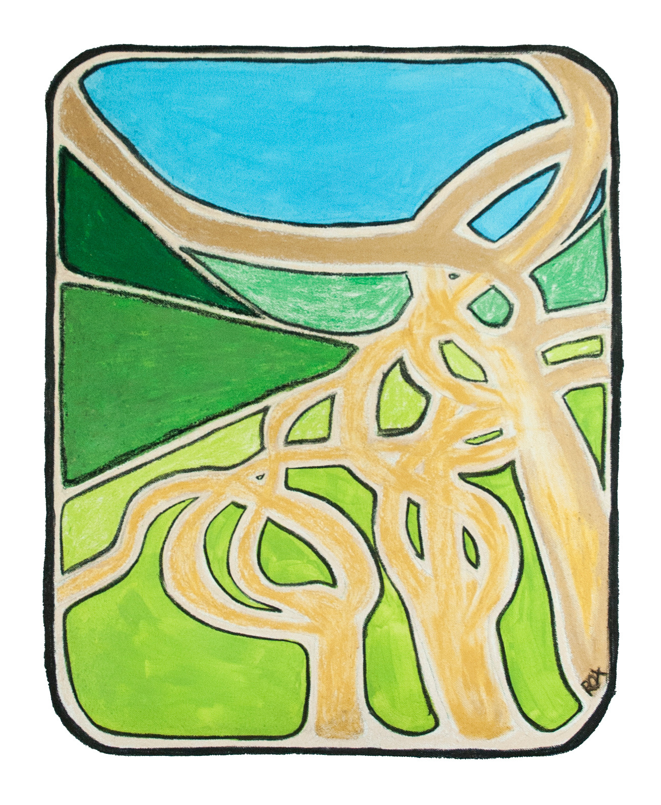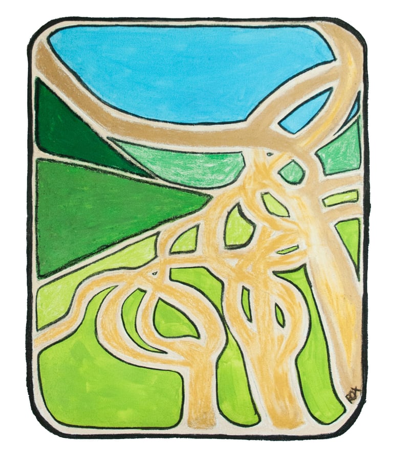 Suite à la demande du client, la toile apparait comme la vision d'un paysage type de la vallée de la Loue et plus précisément de Vuillafans (où sont situées les vignes utilisées pour ce négoce de vin). Nous notons la particularité des vignes dessinées en premier plan, à savoir la taille en lyres.