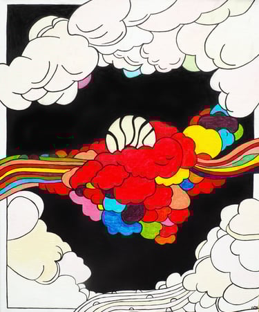 Cuvée Domaine. Les étiquettes des cuvées domaines ont une même thématique à savoir les nuages. La réalisation a demandé un travail plus figuratif en lien avec les noms des cuvées trouvé par le vigneron.