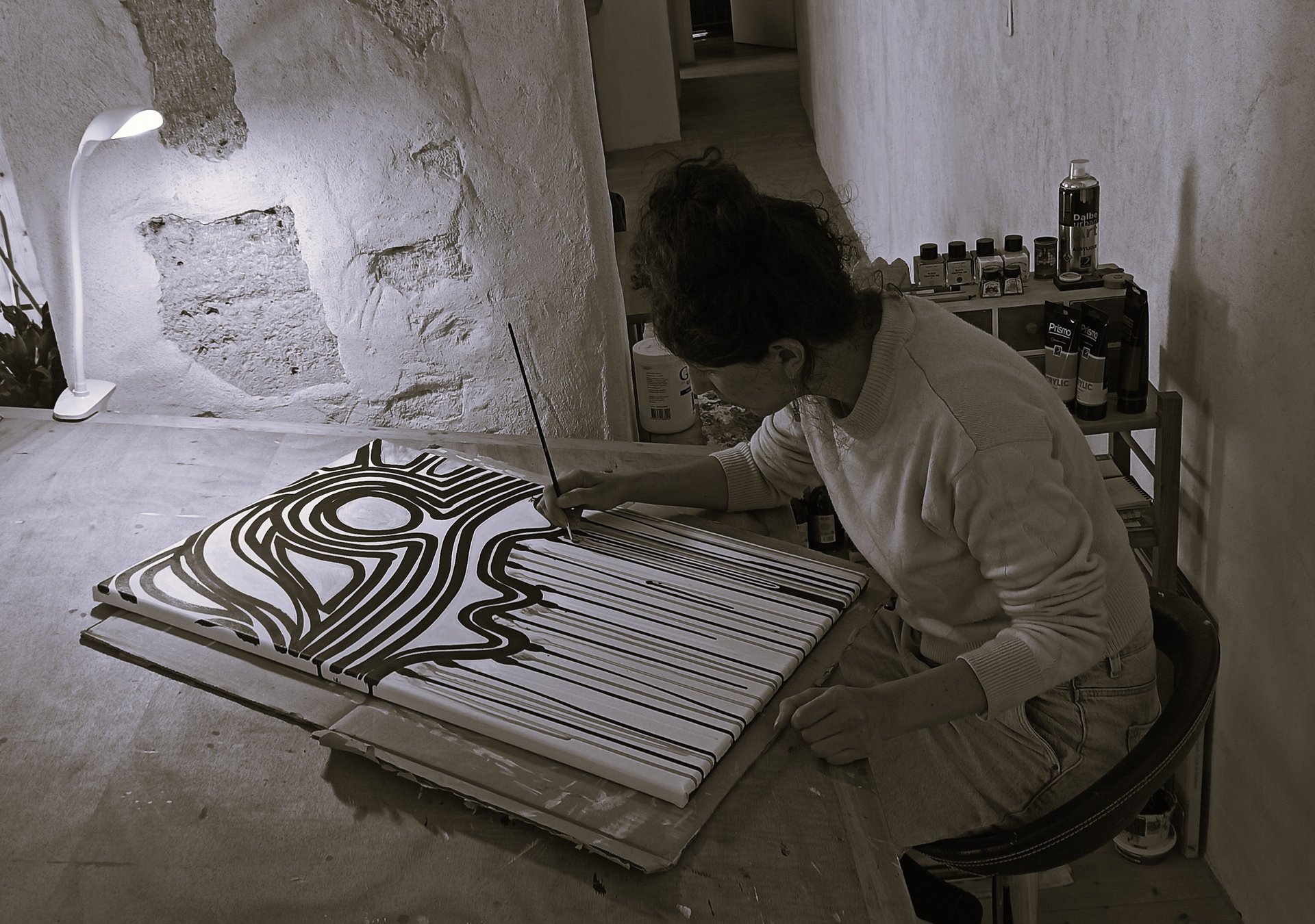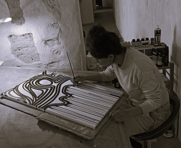 Autodidacte, elle travaille l'acrylique et l'encre de Chine sur toile et papier.